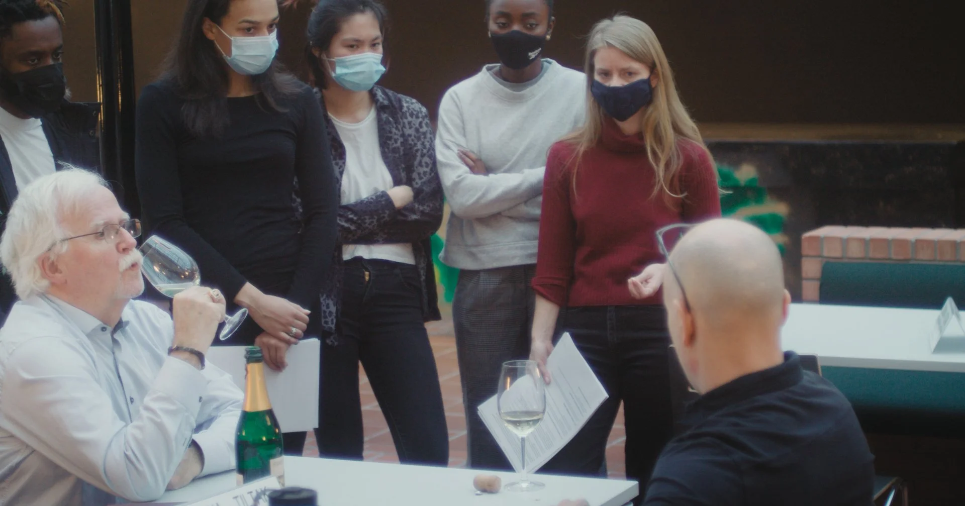 Elever protesterer overfor rektor under corona-pandemien fordi han har leid ut skolen til andre aktører mens de selv må holde seg hjemme. (Foto: Filmbyrået Jack)