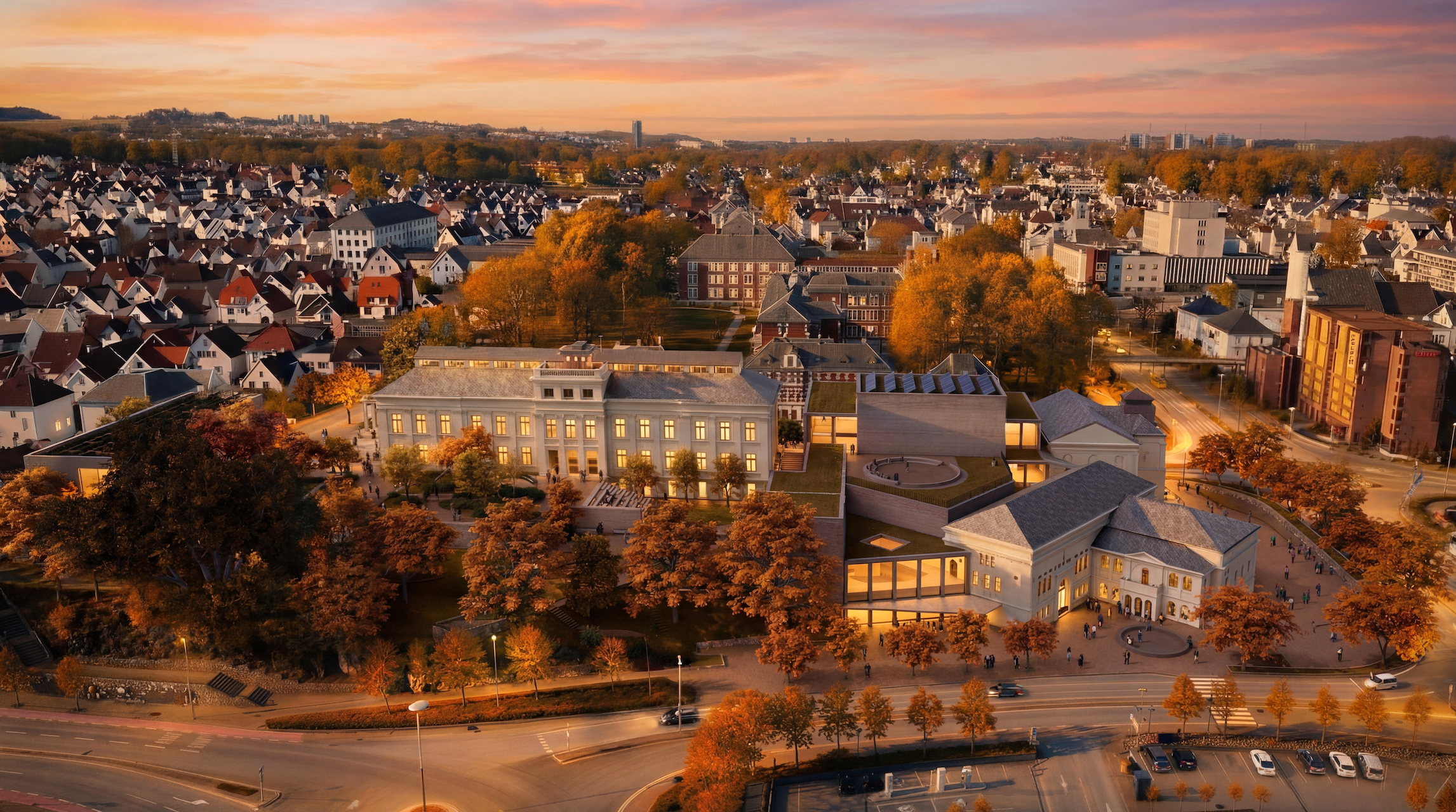 Vinnarutkastet Etter Eckhoff - mellom trær, bygg og by, teikna av Lund Hagem, DRDH Architects, Jonas Thor, Edit og Arup. Stavanger museum til venstre, Rogaland teater ligg til høgre i biletet.